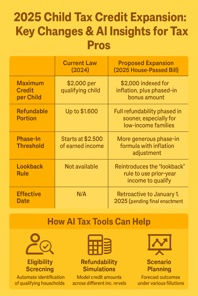 The Child Tax Credit (CTC) remains a cornerstone of family-focused tax relief. In 2025, lawmakers are pushing for a targeted expansion of the credit—bringing new implications for refundability, phase-in thresholds, and eligibility rules. For CPAs and financial advisors, understanding these nuances is essential. But the real edge comes from leveraging AI tax research and AI tax planning tools to interpret and implement these changes efficiently.