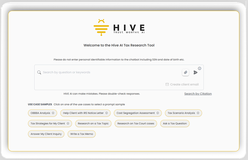 The 2026 tax season demands speed and accuracy. For CPA firms and accounting professionals, Hive Tax AI is the all-in-one tax research and planning assistant built to cut hours of manual work, reduce errors, and elevate your advisory capabilities. Hive Tax AI is designed specifically for tax professionals who need fast, authoritative answers and strategic insights all in one place.
