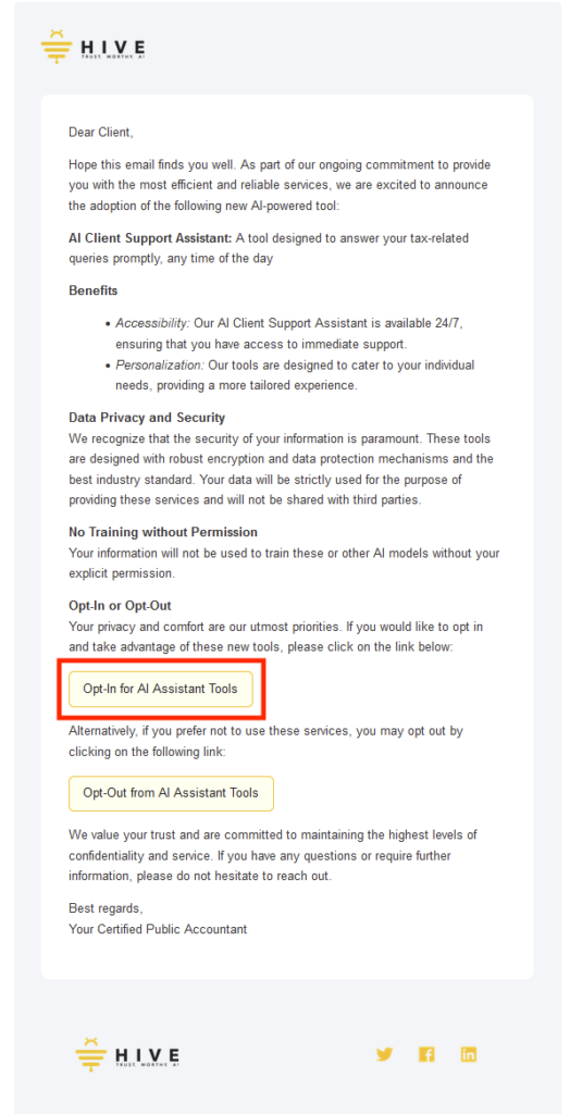 When your CPA / Tax Firm invites you to Hive Tax AI you will receive an email similar to the example below, inviting you to Opt-In to Hive Tax AI Assistant Tools.