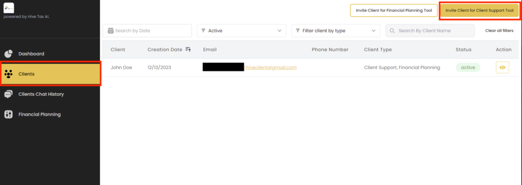 To invite a client to the AI Customer Support Assistant that you did not give access to initially, select the Clients tab from the left sidebar menu. Then at the top right of the Clients page, select the Invite Client for Client Support Tool button at the top right and fill out their information to send them an invite to join.