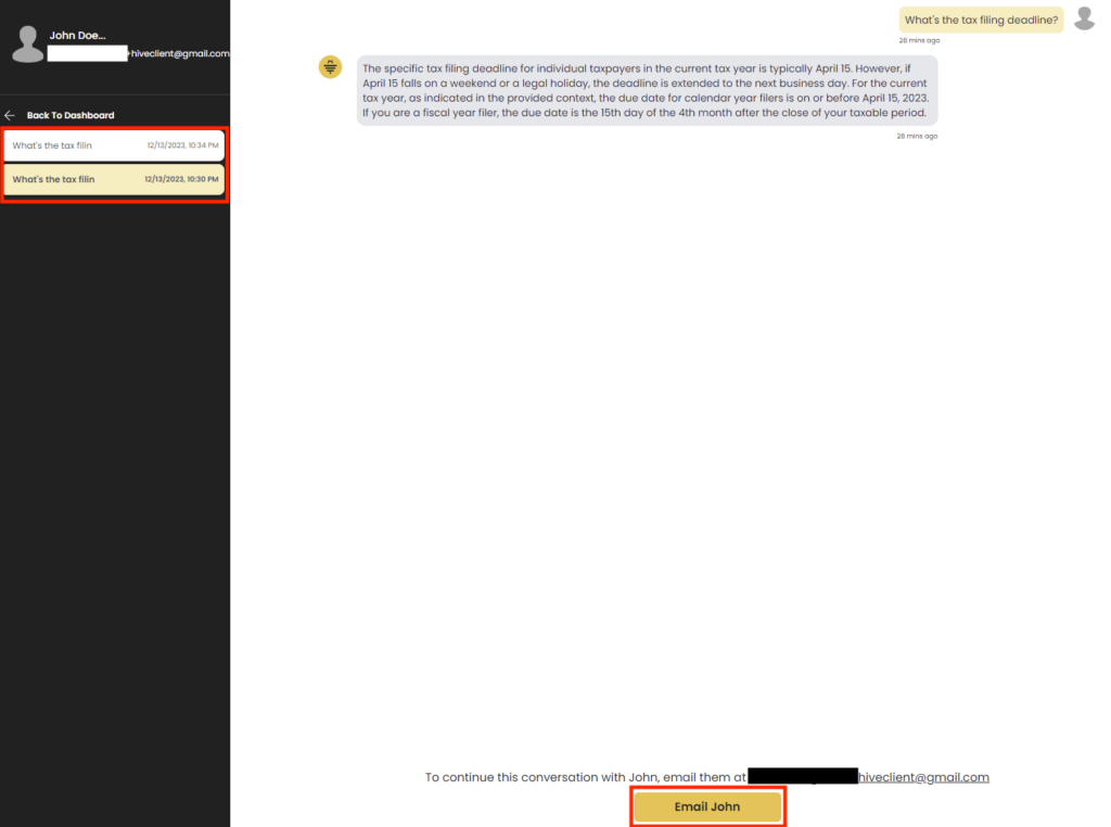 After selecting the view chat option, the Customer Support Assistant chat history page for that client will be shown. On the left side of the chat history you can see the conversations the client has had with the assistant. If one of those conversations has an unread message the background will be yellow.