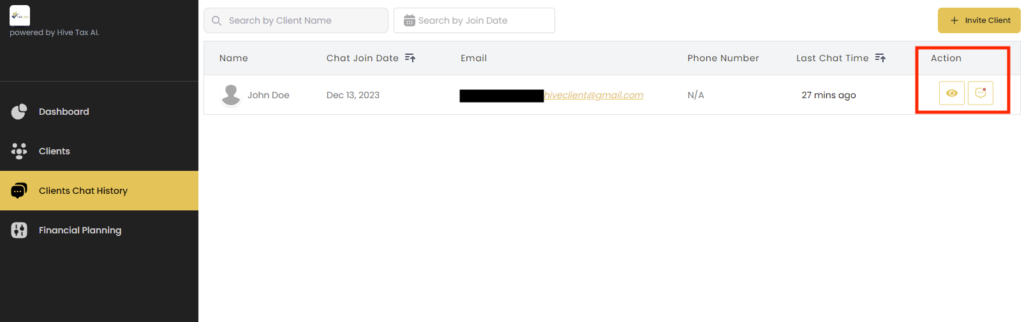 From the Clients Chat History page you can view your clients information, see when the last time they sent a chat to the Customer Support Assistant, see if there are any unread messages, and view your clients chat history with the assistant. In the Action column for your client, you can view your clients chat history by selecting either they view icon or the unread message icon.